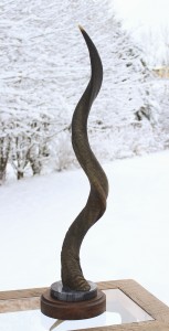 Two beautiful black Kudo Horns mounted on marble and walnut bases. One-of-a-kind pieces, for sale.